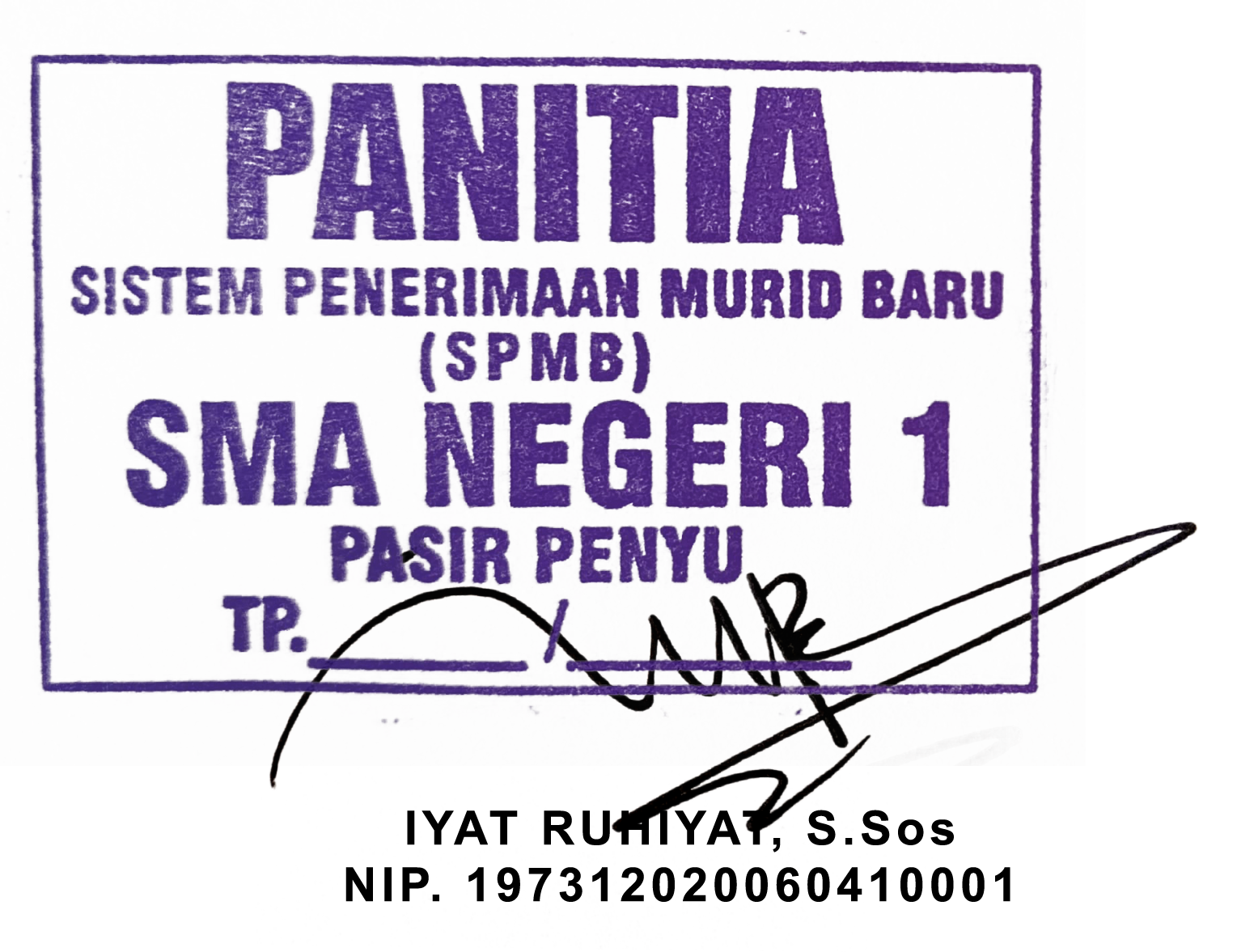 - Pertemuan orang tua wali calon Murid Baru pada tanggal 05 Juli 2025, pada pukul 09.00 wib di Aula SMAN 1 Pasir Penyu, dan calon Murid Baru wajib hadir memakai baju seragam olah raga sekolah asal.